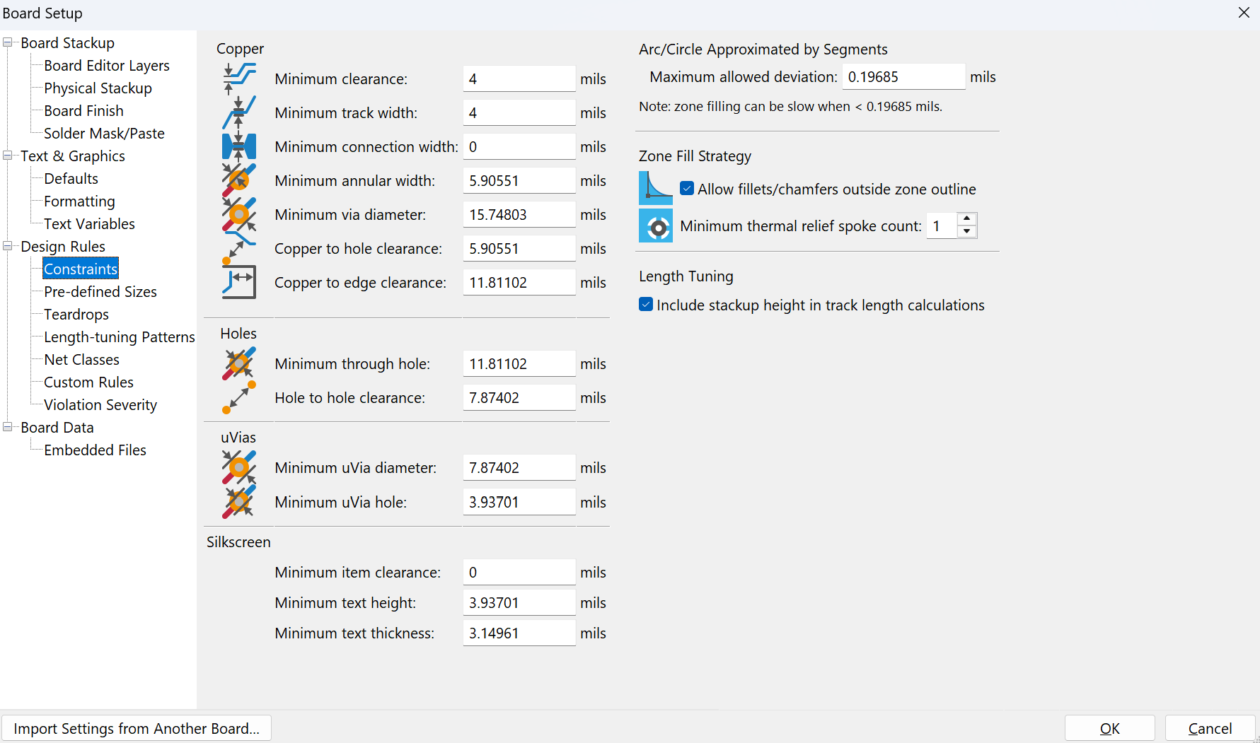For your convenience, under Pre-defined Sizes, you should add some standard track widths and via sizes so during actual routing you can quickly switch between your values. Some “normal” widths would be like 6 mils, 8 mils, 10 mils, 12 mils, 15 mils, 20 mils, and 25 mils. Similarly for vias, set up some nice round numbers from the minimum via size upwards (making sure the size is 2x the drill).